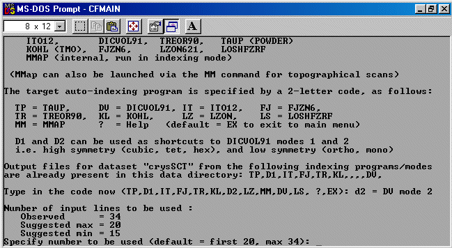 Dicvol - high symmetry modeAfter viewing the LePage summary file, Crysfire will return to the main menu ready to index again. Using the INdex command, select Dicvol high symmetry mode (D1) and go with all the defaults. This gets around some problems with Dicvol searching out in volume shells and not terminating before reporting the highest symmetry solutions. Unless you have a lot of time, it could be best to avoid trying to using the Triclinic option in Dicvol.