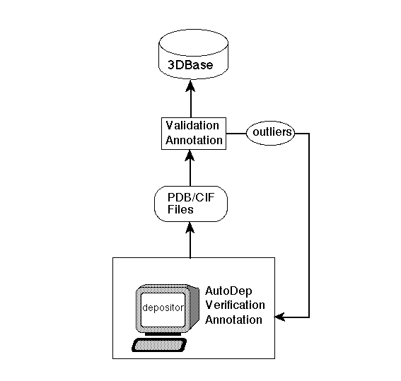 To make automatic deposition as easy as possible, we are working with developers of software commonly used by our depositors. By modifying these programs to produce compliant data files and performing validation and consistency checks before submission, it may be possible to bypass most of the tedious steps in deposition. We are already working with Dr. A. Brünger to use procedures available through X-PLOR [27] to replace part of the validation suite for structures produced by X-ray crystallography and NMR. Diagnostic output will be included automatically as annotations in the entry. A limited version of X-PLOR will be available from BNL to all depositors for validation purposes only.