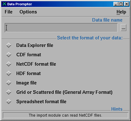 Choose "Import data" in the main menu of OpenDx. It will open the "Data prompter" window.