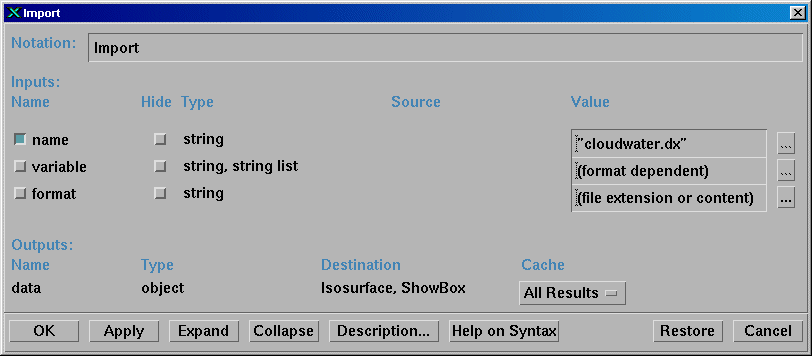 the string "cloudwater.dx" with c:/opendx/data.general. This is the name of the data description file