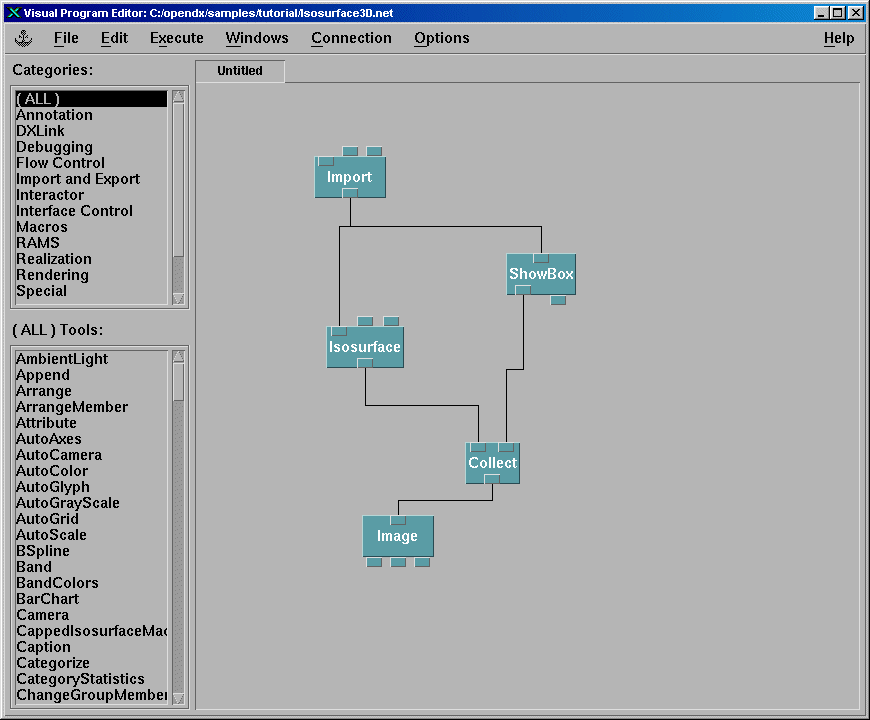 Open file c:/opendx/samples/tutorial/Isosurface3D.net. It will start the "Visual program editor".