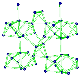 The t-AlF3 structure did not presented new rings of AB6 octahedra. The whole 6-connected 3D net family is built from rings of 3, 4, 5 and 6 octahedra. However, four new building units were inside t-AlF3. The 6 previously known are tetrahedra of octahedra 34 (a geomerical object bounded by 4 triangular faces), prisms with triangular basis 3243 (2 triangular faces and 3 tetragonal faces), tetragonal basis 46 (six tetragonal faces : a cube), pentagonal basis 4552, hexagonal basis 4662 and finally the Friauf polyhedra 3464 characterizing the pyrochlore structure. Only the A atoms at the net points are shown below for the four new building units existing in t-AlF3 :