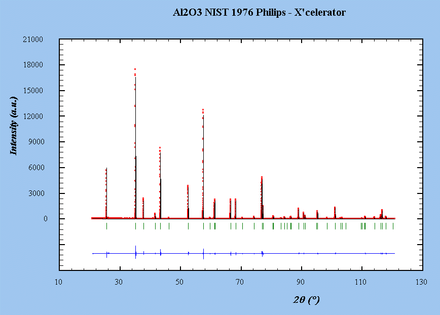 If you are interested in the test patterns, you may download here (zipped .uxd file) the fixed slit pattern. Recording conditions are : Bragg Brentano geometry, Cu-Kalpha, graphite monochromator in the diffracted beam, Soller 2°, divergence slit 0.5°, antiscatter slit 0.5°, Soller 2°, receiving slit 0.1mm.
